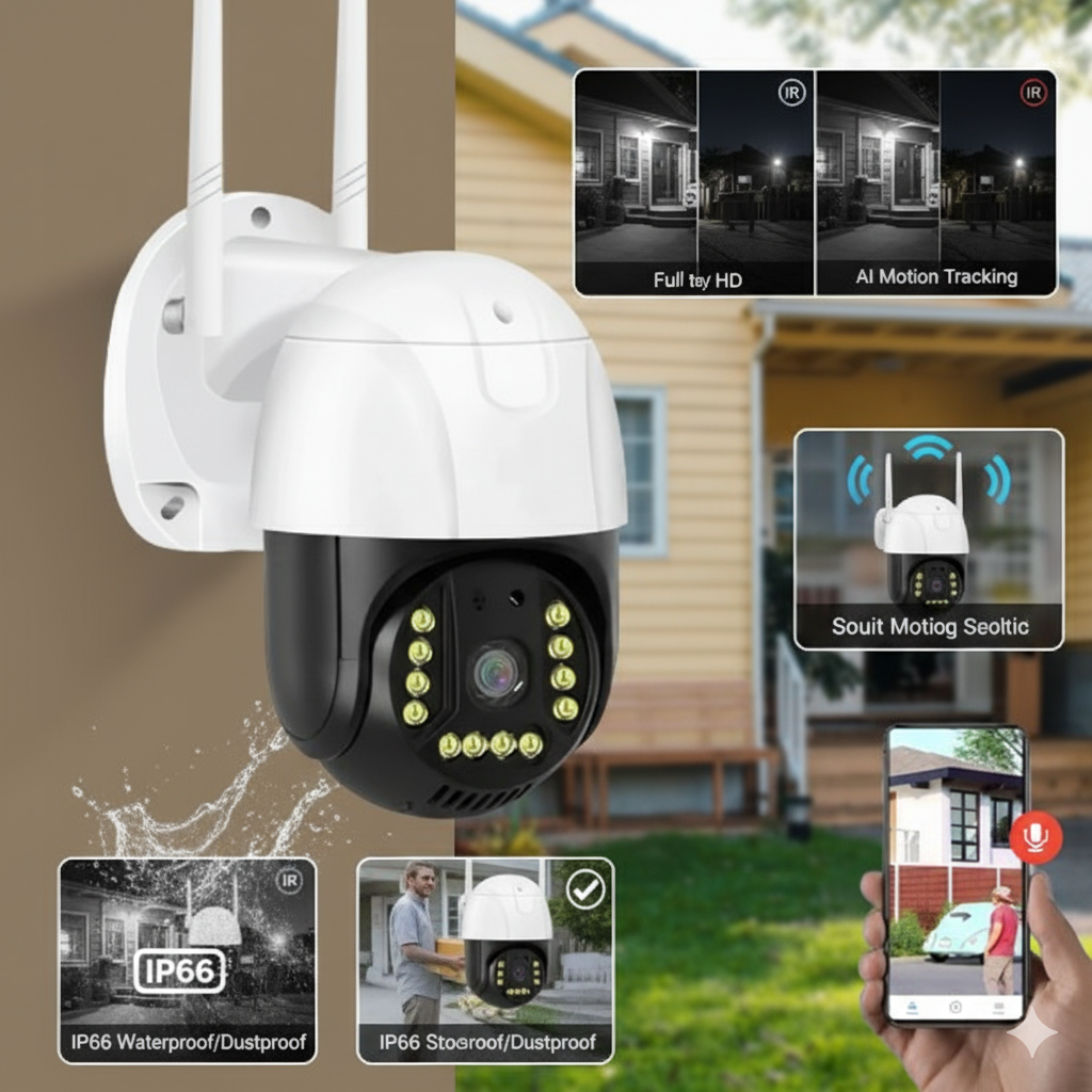 نقدم لك كاميرا المراقبة الخارجية الذكية (PTZ)، الحل الأمثل لتأمين محيطك. هذه الكاميرا ليست مجرد كاميرا عادية، بل هي نظام مراقبة متكامل يوفر لك رؤية بانورامية 360 درجة، مع إمكانية التحكم بها عن بُعد من هاتفك الذكي.
